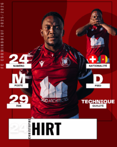 24 HIRT Christophe RichardPar Vincent GENOUD / 18 octobre 2025 5. MBENZA Cedric6. BULAY Masasa7. VAZ DA VEIGA Pedro Jeremias7. MAKSHANA Qendrim8. NGUYEN Phi10. DINDAMBA Elie12. DA SILVA RODRIGUES Antonio Joao13. HAYOZ Julien14. DA COSTA FERREIRA Hugo Manuel15. DA SILVA SEMEDO Wilson16. ALMEIDA OLIVEIRA Andre Daniel19. CODJO Ayi Firmain20. THIAM Ibrahima21. HOTI Lendi21. MBELENGA Gladis23. MONTEIRO VARELA DA SILVA Gilson23. PERRIN Mathieu24. HIRT Christophe Richard25. PINHO RAMALHO Gabriel27. PEREIRA DA SILVA Victor Hugo45. GARCIA Steve77. DOS SANTOS RODRIGUES Abrianson80. LOPES VARELA Nuno Miguel91. SEKOVSKI Mario94. MAHMUD Khalil99. LUNGHI Alessandro99. MAGNIN Jason99. NTUMBA Jordy #24NomHIRT Christophe RichardPositionMILIEU