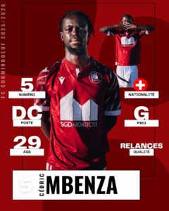 5 MBENZA CedricPar Vincent GENOUD / 18 octobre 2025 5. MBENZA Cedric6. BULAY Masasa7. MAKSHANA Qendrim7. VAZ DA VEIGA Pedro Jeremias8. NGUYEN Phi10. DINDAMBA Elie12. DA SILVA RODRIGUES Antonio Joao13. HAYOZ Julien14. DA COSTA FERREIRA Hugo Manuel15. DA SILVA SEMEDO Wilson16. ALMEIDA OLIVEIRA Andre Daniel19. CODJO Ayi Firmain20. THIAM Ibrahima21. HOTI Lendi21. MBELENGA Gladis23. MONTEIRO VARELA DA SILVA Gilson23. PERRIN Mathieu24. HIRT Christophe Richard25. PINHO RAMALHO Gabriel27. PEREIRA DA SILVA Victor Hugo45. GARCIA Steve77. DOS SANTOS RODRIGUES Abrianson80. LOPES VARELA Nuno Miguel91. SEKOVSKI Mario94. MAHMUD Khalil99. MAGNIN Jason99. LUNGHI Alessandro99. NTUMBA Jordy #5NomMBENZA CedricPositionDEFENSE